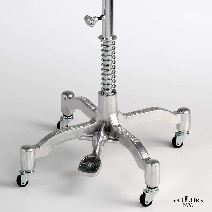 La base a quattro ruote, detta "americana", permette facili spostamenti nelle vetrine non segnando i pavimenti. Dona stabilità al manichino e si abbina a diversi ambienti. Materiale: alluminio brillantato, pezzo unico con scritta del marchio pressofusa. L'asta in ferro è resistente e facilmente regolabile in altezza con uno scarto di 30 cm: da 85 cm fino a 115 cm.